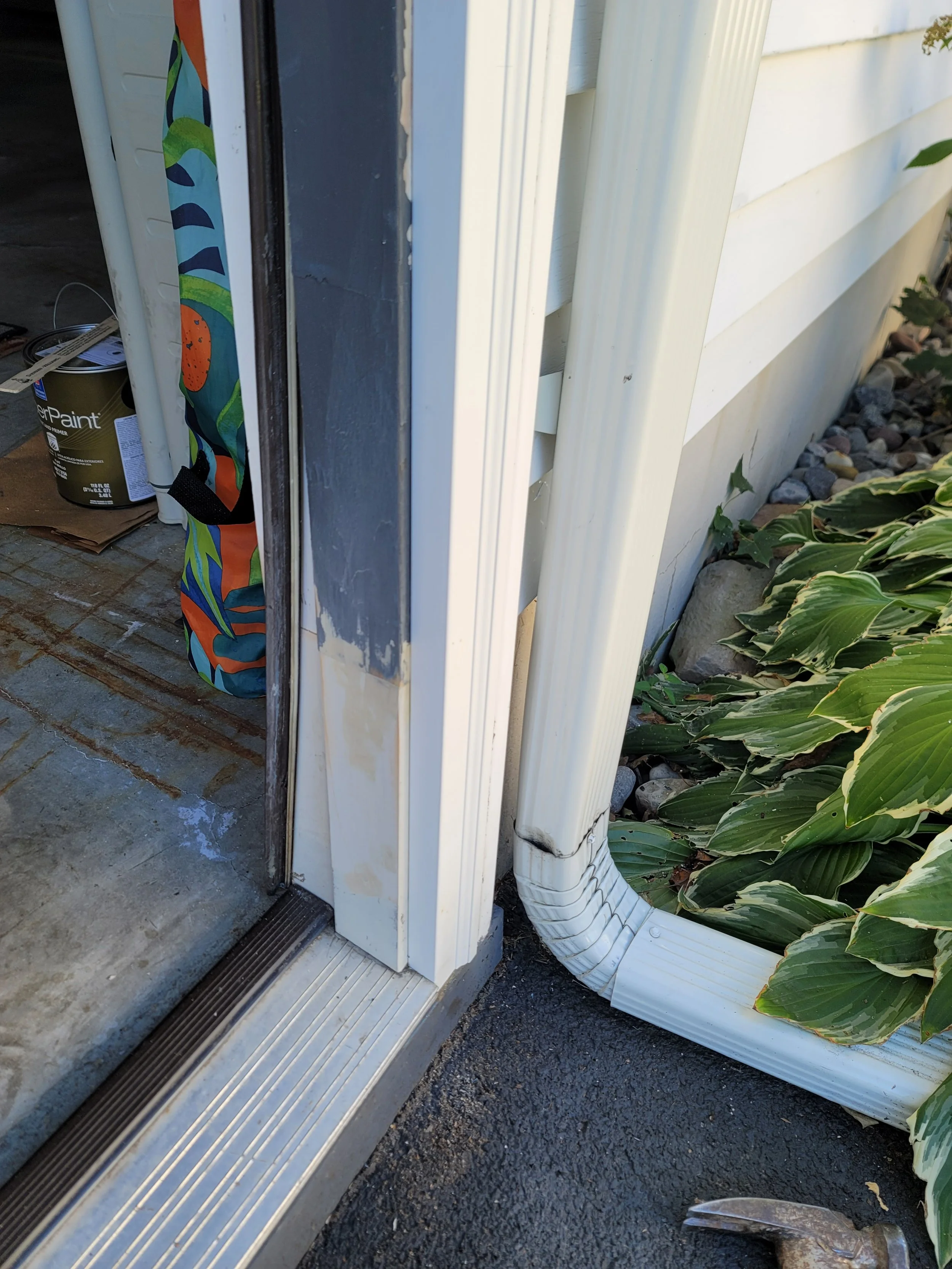 Rotted door jamb replaced. prepping for paint. Also installed new rot free pvc brickmold